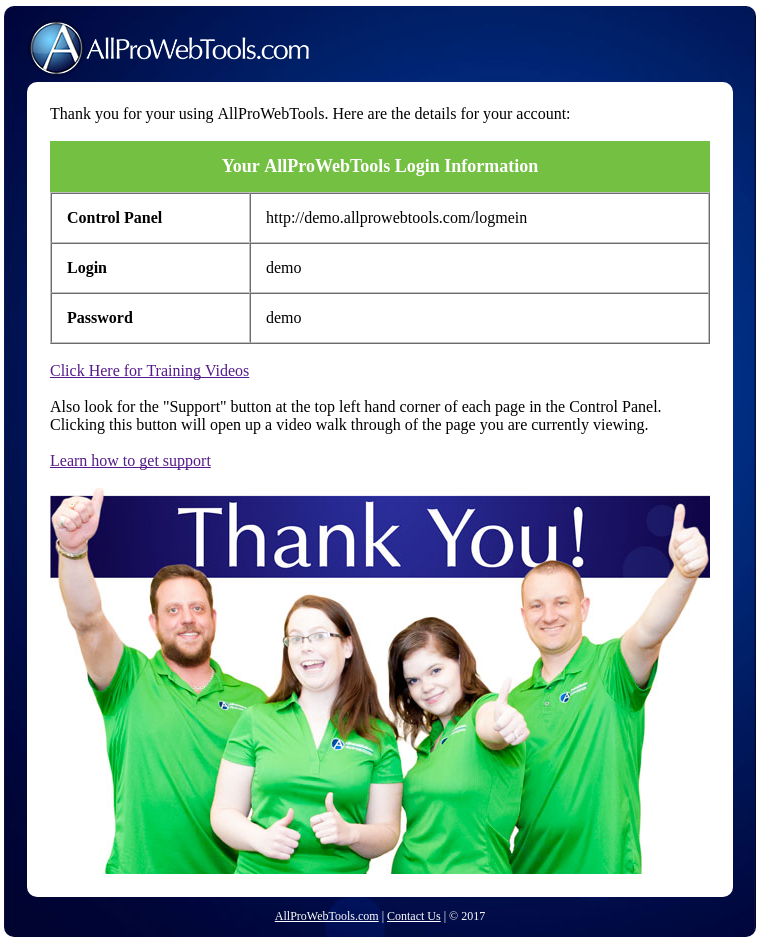 You should have received an email when you originally set up your account. The email subject line was: "AllProWebTools Login Information", this email has important information about how to get logged into your account. When you open the email, it will look like this: