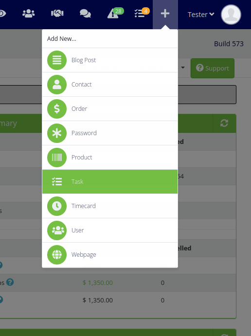 We've also added the ability to create a new order, a new task, or a new timecard entry right from a task that's associated with a CRM record. Just click on the dollar sign, task list, and clock icon next to the contact's name, respectively.