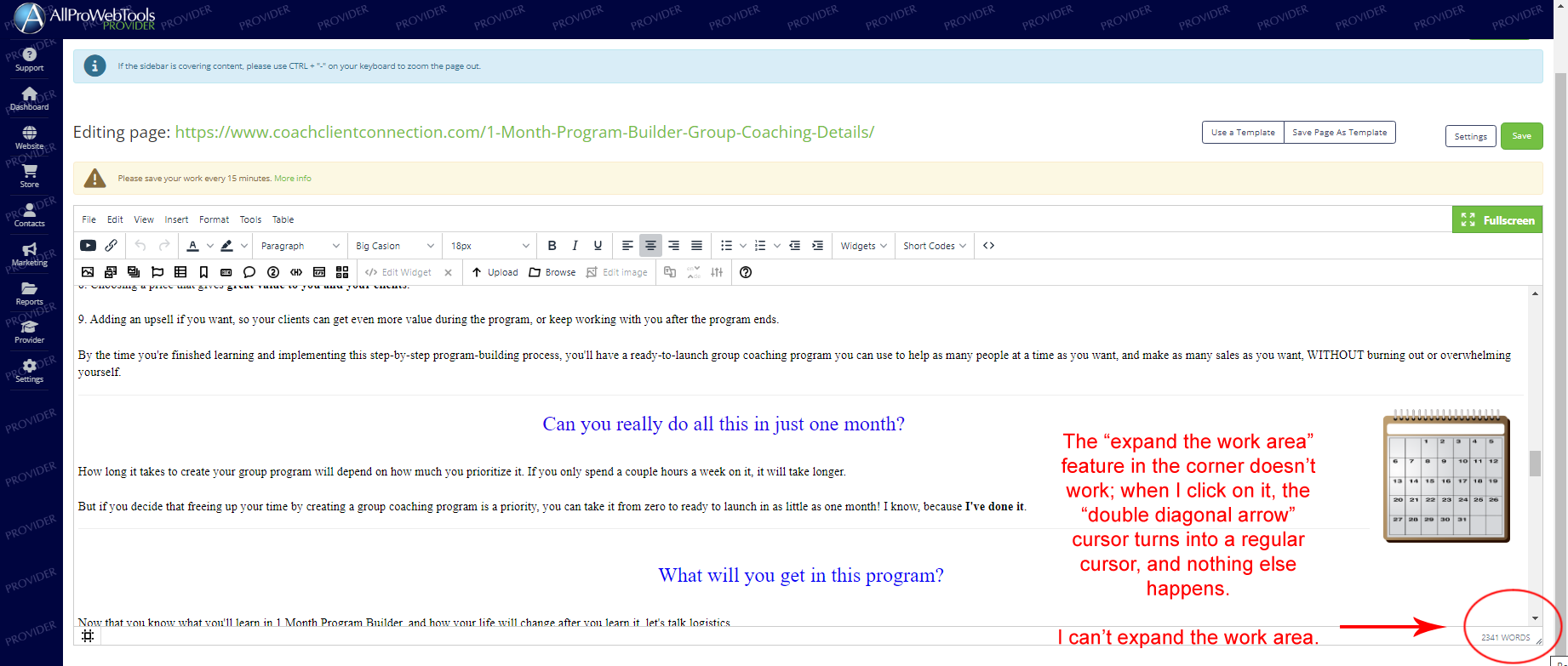 You know that spot in the lower-right corner of the text/work area you'd normally click and drag to make the area you write in bigger? The one in APWT's website builder isn't working; see the image below. The red text pertains to the technical problem; the rest is just part of the web page.
